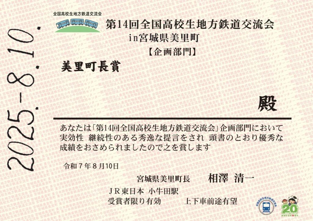 【 賞 状 】 硬券を模した賞状を授与 *硬券とは鉄道会社の乗車券を指します